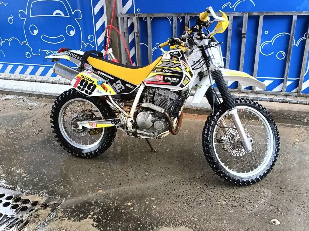 Лёгкая рама и простая геометрия делают DR250 живой в грязи и на тропах. Она прощает ошибки, легко переносит небольшие падения и простая в ремонте прямо на месте. Подвеска не из премиум‑класса, но для умеренного офф‑роуда её хватает.